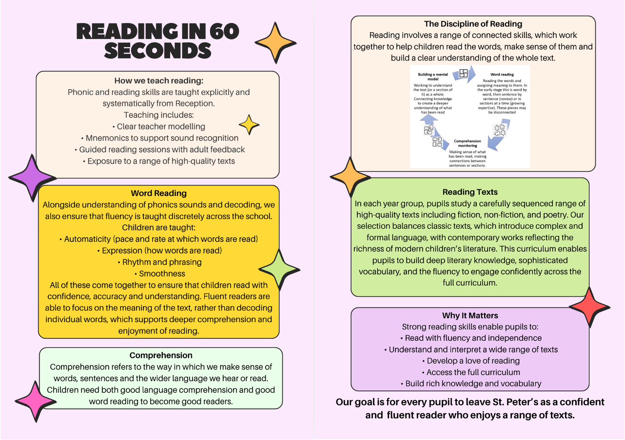 Reading is the foundation of our English curriculum at St Peter’s CE Primary Academy. We aim to develop fluent, confident readers who read widely and with understanding, and who develop a lifelong love of reading.